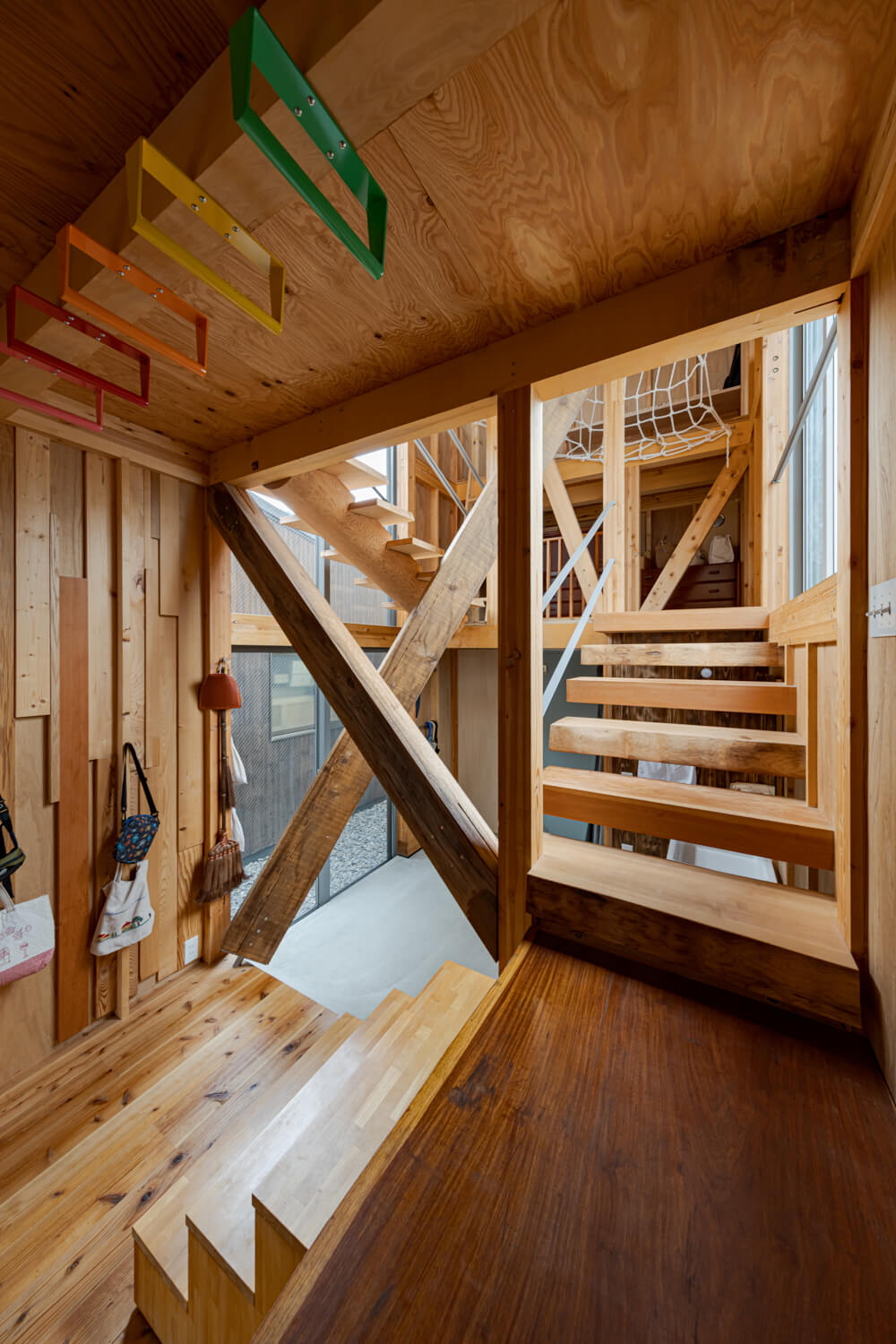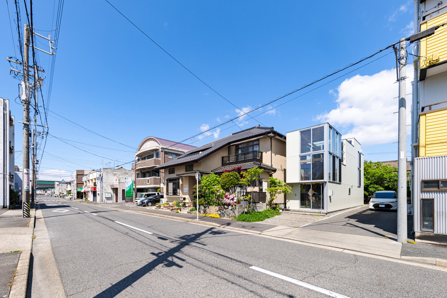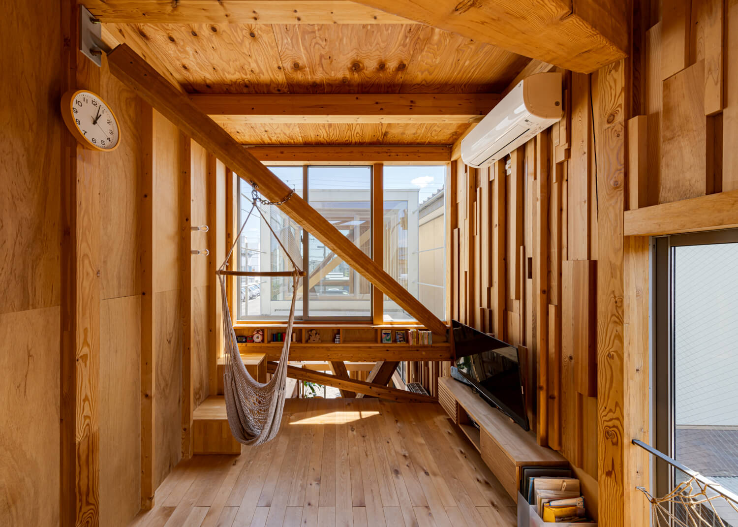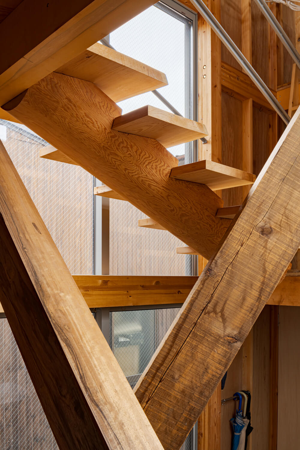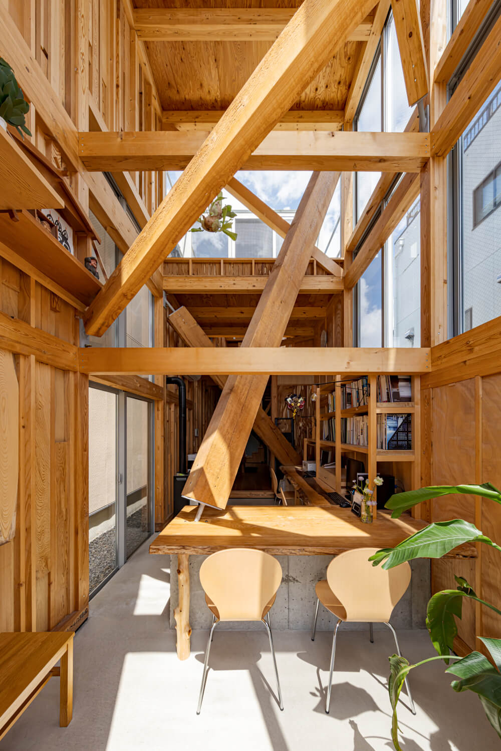 敷地周辺は1階に店舗や事務所などの商工の機能、2階以上に住機能をもつ構成が多く見られる地域であるが、大きなショッピングモールの台頭などにより近年廃業している場所も多く、2階などに居住しているにも関わらず、まちに面するグランドレベルでは、いたるところでシャッターが閉まっている。長年この地に暮らす施主家族は、町づくりの重責を担う工務店として、開かれた町並みの形成を目指すステートメントとしての建築をつくりたいと希望していた。本計画では、建物内における商工住の明確な線引きをなくし、商工および住の空間が分断することなく、それぞれ町に対して接続しながらも適度に距離感を調整できるようなあり方を目指している。具体的には、在庫木材を保存された長さ形を極力残したままで、構造ブレースの役割を果たす斜材として使用する。これらにより必要な構造耐力を満たすことで、短辺方向に極力不透明な構造壁を出さず、前面道路から透明度の高い内部空間となりながらも緩やかに商と住の空間を分節していく。保存されていた在庫木材の寸法を定数として扱い、変数的に階高や平面寸法を調整するように設計していった。