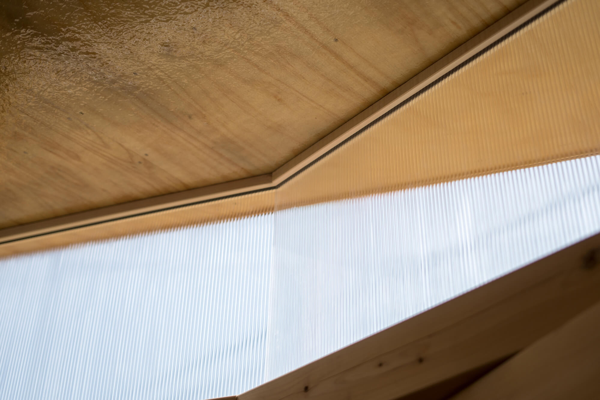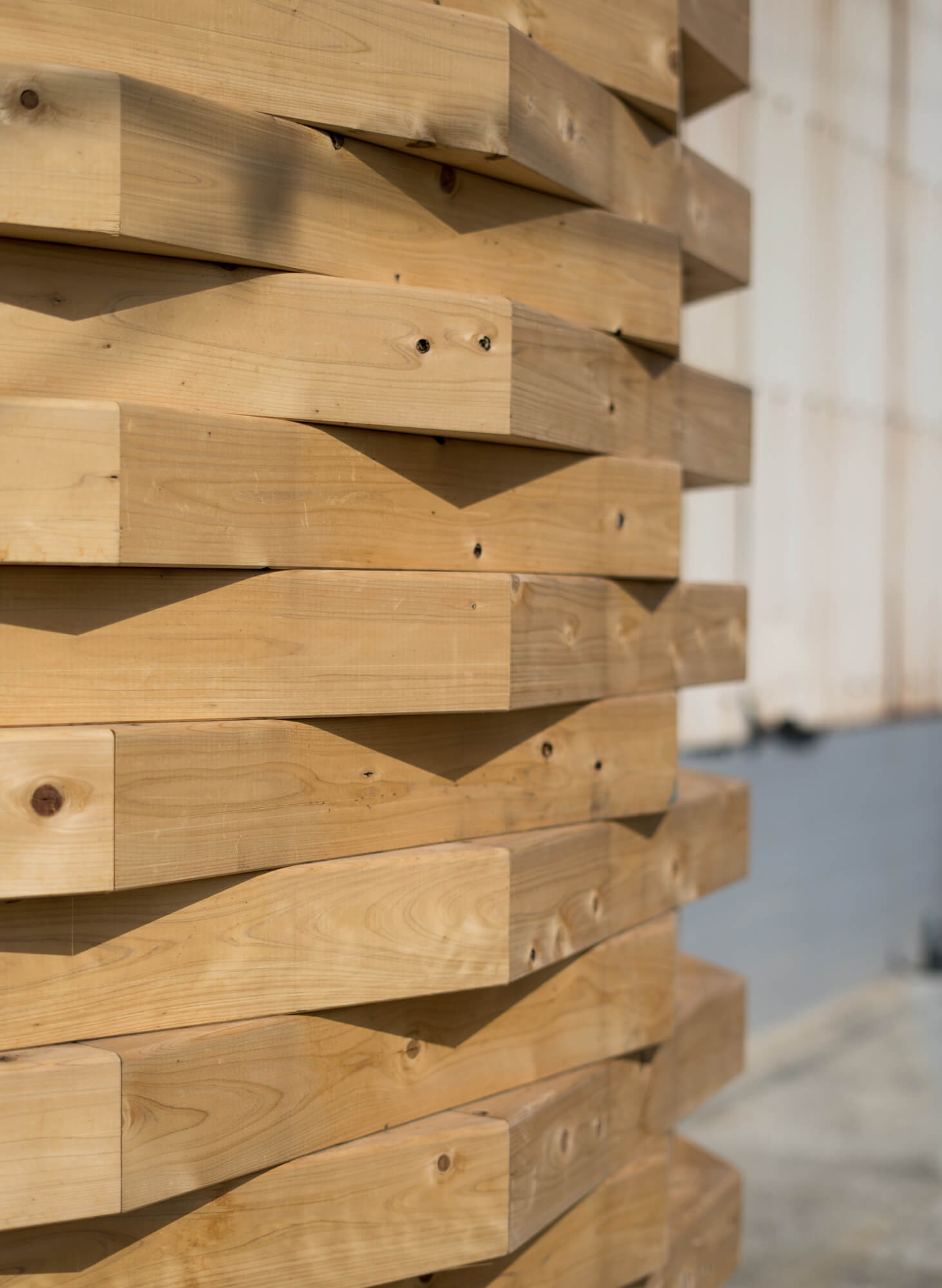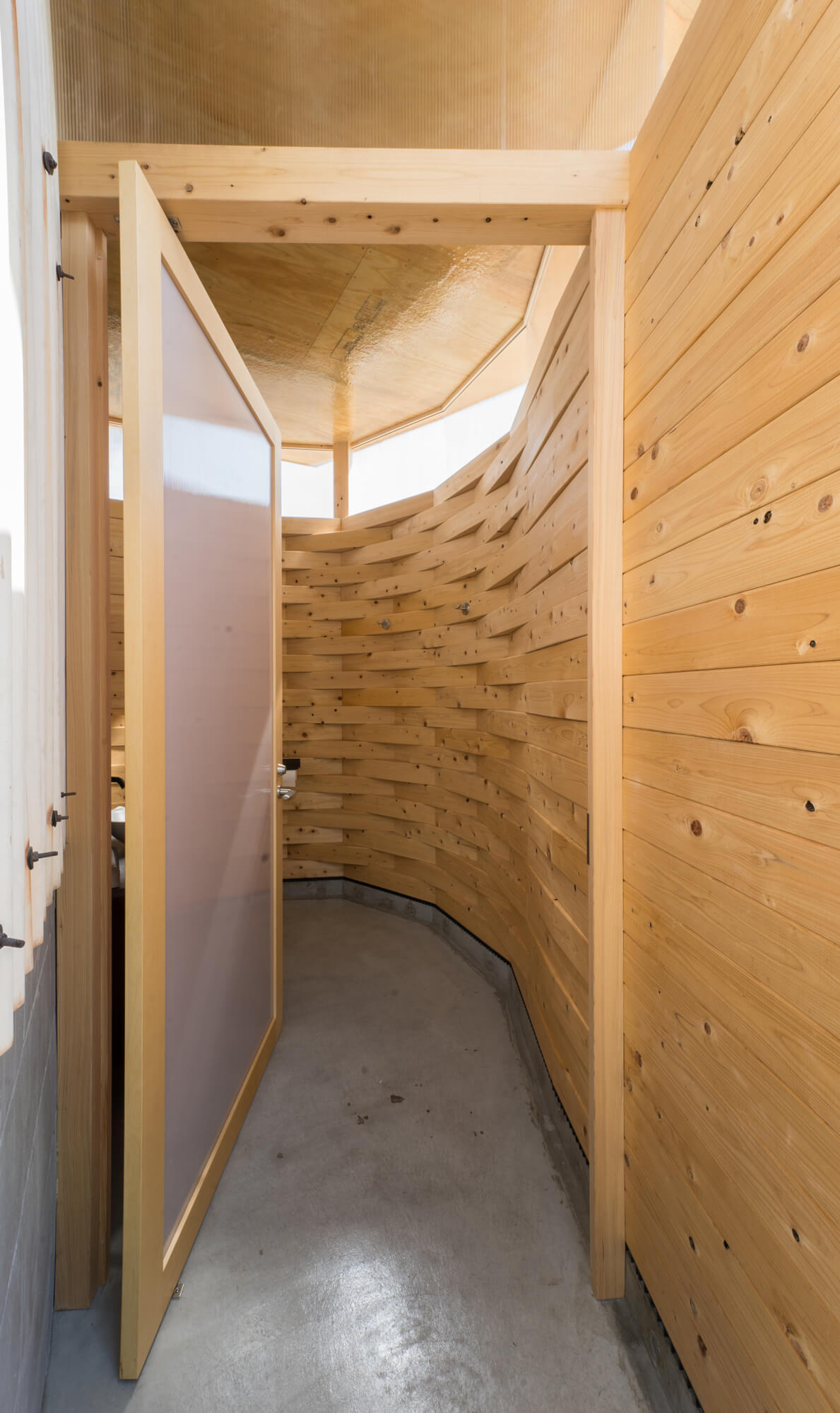 具体的には、通常は軸組として用いられる120角の構造用ヒノキ無垢材をブロック状に加工し、それらを積層して空間を構成している。平面方向の角度をわずかずつずらしながら積み上げることで、在来軸組構法では難易度やコストの高い曲面壁を、シンプルな操作で実現している。その立ち姿は、合理的に計画された既存倉庫の直線的な外壁に対して、柔らかく寄生するように付加され、場に新たな層を与えている。旧木造倉庫という文脈に対し、「木造組積造」とも言える構造用無垢材の新たな使い方と建ち方を提示することで、用途転換と素材の再解釈を同時に試みたプロジェクトである。